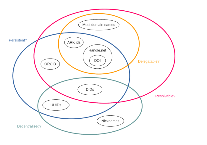 All of these PID systems are based on either DNS or other kinds of central or hierarchical registries. Some of them support various types of delegation. None of them are fully decentralized, and they would not qualify as “self-sovereign” the way we are designing DIDs. That’s okay! Different use cases require different technologies.