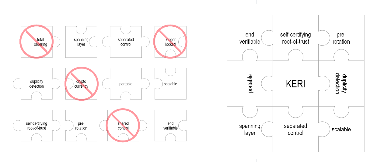 The answer is simple and manifold: blockchains enable many features outside the scope of KERI. These features bring with them complexity, diversity, scale costs, and trust issues. Within KERI’s scope, however, only some of a blockchain or distributed ledger technology’s (DLT’s) features are necessary. Total ordering and double-spend protection, for instance, are hallmarks of distributed ledgers, but hardly justify the added complexity here.
