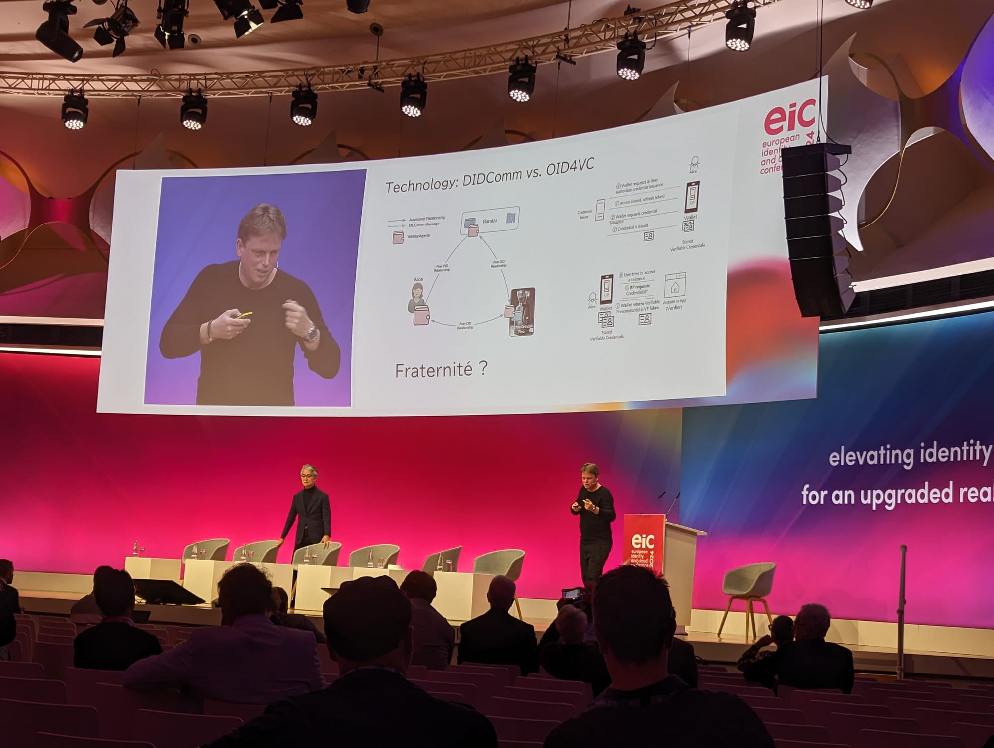 Markus observed that technology embodies the values of the community that spawns it. He illustrated this by comparing W3C versus SD JWT VCs - contending that the W3C format offers more "Liberte" - as well as DIDComm versus OID4VC - arguing that DIDComm features more "Fraternite". Here's a flavor of their conversation (apologies to both for any mistakes in capturing your comments).