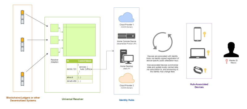 Identity Hubs: secure personal datastores that coordinate storage of signed/encrypted data, and relay messages to identity-linked devices